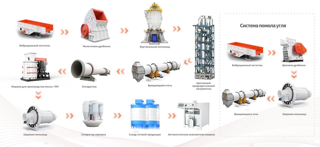 При производстве цемента в качестве основного сырья используются известняк и глина, которые дробятся, дозироваются и измельчаются в вертикальных мельницах для получения сырьевой муки, которая затем подается во вращающуюся цементную печь для обжига клинкера. Затем к клинкеру добавляют соответствующее количество гипса, смешивают с некоторыми смешанными материалами или добавками и измельчают в цемент через цементную мельницу, который затем транспортируется упаковочной машиной или бестарной машиной перед отправкой с завода. Оборудования для производства цемента используют процесс производства цемента сухим способом. Сырье сушат и измельчают в сырой порошок, а затем подают в сухую вращающуюся печь для обжига клинкера. Главным преимуществом сухого производства является низкий расход тепла.